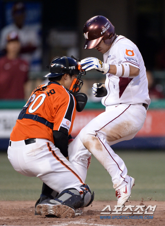 20일 목동구장에서 프로야구 넥센과 한화의 주중 3연전 첫 번째 경기가 열렸다. 넥센 4회 무사 1, 3루에서 박헌도의 외야플라이 타구 때 3루주자 김민성이 홈에서 태그 아웃을 당하는 것처럼 보였으나 이영재 주심은 세이프를 선언했다. 한화 정범모 포수에게 태그를 당하고 있는 김민성. 목동=송정헌 기자 songs@sportschosun.com/2014.5.20 |