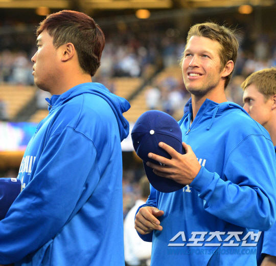 LA 다저스 류현진이 10일(한국시각) 미국 캘리포니아주 로스엔젤레스 다저스타디움에서 디트로이트 타이거즈와의 홈경기를 덕아웃에서 지켜봤다. 경기 전 미국 국가 연주 때 커쇼와 류현진이 그라운드에 나와 있다. 이날 훈련에서 불펜피칭을 소화한 류현진은 오는 12일 애리조나 원정경기에 등판할 예정이다. 로스엔젤레스(미국 캘리포니아주)=정재근기자 cjg@sportschosun.com