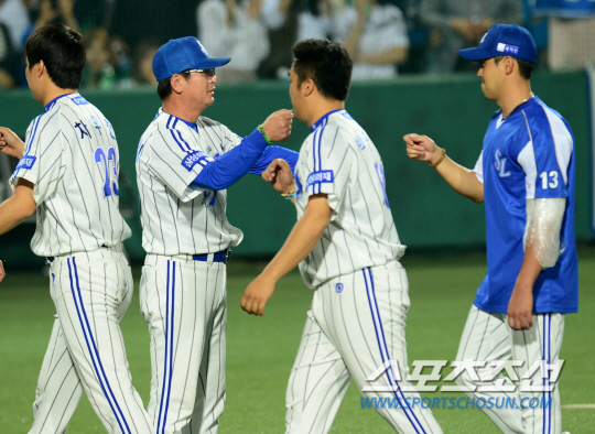 넥센 히어로즈와 삼성 라이온즈의 2014 프로야구 경기가 23일 대구 시민운동장 야구장에서 열렸다. 6-3으로 승리를 거두며 9연승을 달린 삼성 선수들이 류중일 감독과 승리의 기쁨을 나누고 있다. 9연승은 류중일 감독 부임 후 최다연승이다! 대구=정재근 기자 cjg@sportschosun.com