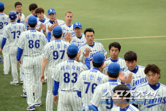 넥센 히어로즈와 삼성 라이온즈의 2014 프로야구 경기가 25일 대구구장에서 열렸다. 18-2의 대승을 거두며 파죽의 11연승을 달린 삼성 선수들이 하이파이브를 하고 있다. 대구=정재근 기자 cjg@sportschosun.com/2014.05.25/ |