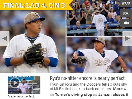 이 매체는 전날 필라델피아전에서 나온 조시 베켓의 시즌 첫 노히트노런 경기를 언급하며 "류현진이 다시 한번 노히트 앙코르를 펼쳤고, 그것은 거의 완벽했다"고 극찬을 아끼지 않았다.