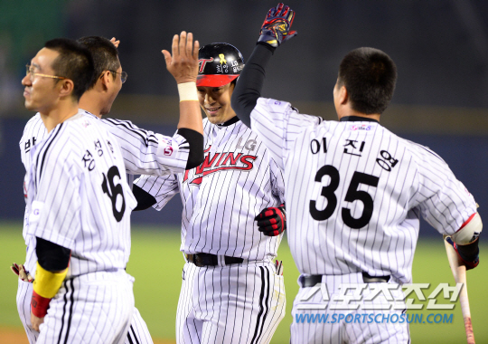 LG 트윈스 정의윤이 끝내기 안타의 주인공이 되며 환호했다.