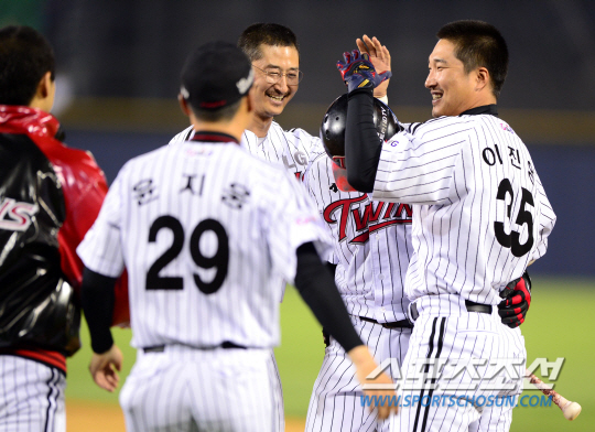 27일 잠실구장에서 프로야구 LG와 삼성의 주중 3연전 첫 번째 경기가 열렸다. LG가 삼성에 5대4로 역전승을 거두며 삼성의 12연승을 저지했다. 9회 무사 1,3루에서 역전 결승타를 날린 LG 정의윤이 동료들의 축하를 받고 있다. 잠실=송정헌 기자 songs@sportschosun.com/2014.5.27