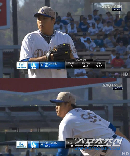 '코리안 몬스터' 류현진(27·LA 다저스)이 메모리얼 데이 기념 군복 무늬(카모플라쥬) 유니폼을 입고 등판했다.