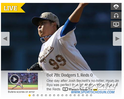 메이저리그 공식 홈페이지 MLB닷컴은 메인 페이지에 류현진의 모습과 함께 "조쉬 베켓이 노히트노런을 기록한지 하루만에 류현진이 7회까지 퍼펙트게임을 진행중"이라고 안내했다.