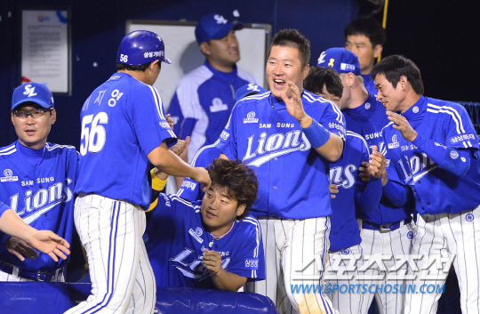 27일 잠실구장에서 프로야구 LG와 삼성의 주중 3연전 첫 번째 경기가 열렸다. 삼성은 시즌 11연승을 기록중이다. 삼성 7회 2사 3루에서 나바로의 적시타 때 득점에 성공한 이지영이 덕아웃에서 동료들과 하이파이브를 나누고 있다. 잠실=송정헌 기자 songs@sportschosun.com/2014.5.27