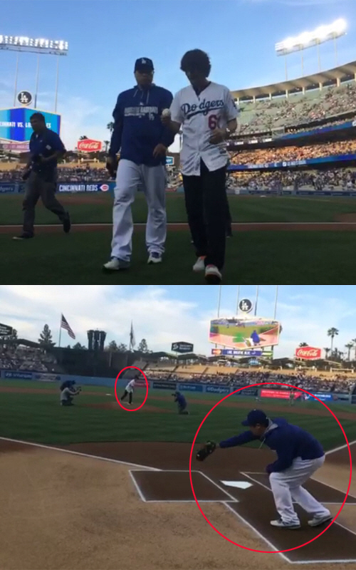 공개된 영상에서 박찬호는 LA다저스의 유니폼 상의에 검은색 바지 차림으로 마운드에 올라 가벼운 동작으로 홈플레이트의 류현진을 향해 시구를 던졌다.
