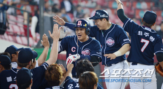 28일 오후 광주-기아챔피언스필드에서 2014 프로야구 두산과 KIA의 경기가 열렸다. 9회초 1사 1루서 두산 홍성흔이 좌중월 2점 홈런을 친 후 덕아웃에서 동료들과 환호하고 있다. 광주=김경민 기자 kyungmin@sportschosun.com / 2014.05.28.