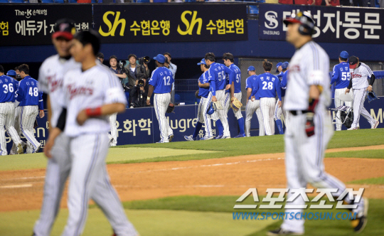 27일 잠실구장에서 프로야구 LG와 삼성의 주중 3연전 첫 번째 경기가 열렸다. LG가 삼성에 5대4로 역전승을 거두며 삼성의 12연승을 저지했다. 경기 종료 후 고개를 떨구며 그라운드를 나서고 있는 삼성 선수들. 잠실=송정헌 기자 songs@sportschosun.com/2014.5.27 |