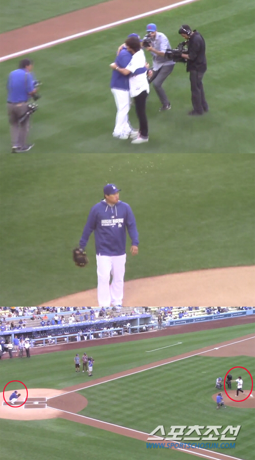 박찬호는 가볍게 어깨를 푼 뒤 편안한 동작으로 류현진을 향해 공을 던졌다. 박찬호의 시구는 다소 스트라이크존을 벗어났지만, 이와 상관없이 한국야구의 레전드로 기억될 두 선수는 뜨거운 포옹을 나눴다.