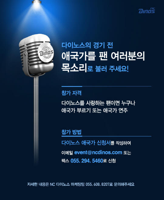 NC를 사랑하는 팬이면 누구나 참여 가능하며, 개인 또는 단체 모두 가능하다. 애국가 제창과 악기를 이용한 연주 모두 가능하다. 참여를 희망하는 팬은 이메일(event@ncdinos.com) 또는 팩스(055-294-5460)로 신청하면 된다. 자세한 내용은 NC 홈페이지(www.ncdinos.com)에서 확인할 수 있다.