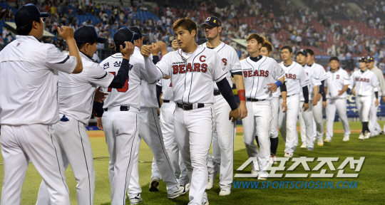 두산과 롯데의 주말 3연전 첫번째 경기가 30일 잠실구장에서 열렸다. 두산이 6-1 승리로 경기를 마무리하며 3연승을 달렸다. 경기 종료 후 하이파이브를 나누는 두산 선수단. 잠실=허상욱 기자 wook@sportschosun.com/2014.05.30/ |