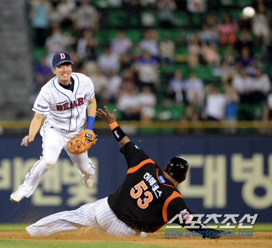 그런 김재호가 송 감독의 기대에 부응했다. 30일 잠실 롯데전에서 4-1로 앞선 6회초 1사 만루서 롯데 박종윤의 타구를 잘 잡아 2루를 직접 밟은 뒤, 강한 송구로 타자마저 1루에서 잡았다. 위기를 맞았던 에이스 니퍼트를 살린, 그리고 팀을 구한 호수비였다.