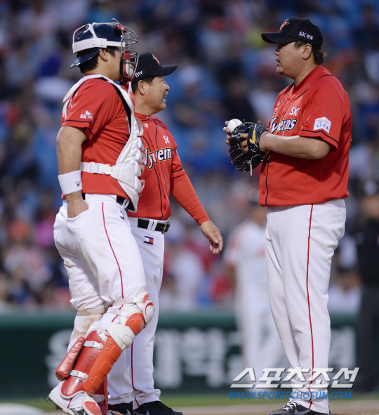 31일 오후 대전 한밭야구장에서 2014 프로야구 SK와 한화의 경기가 열렸다. 8회말 2사서 SK 채병용이 마운드에 오른 이만수 감독과 이야기를 나누고 있다. 대전=김경민 기자 kyungmin@sportschosun.com / 2014.05.31. |