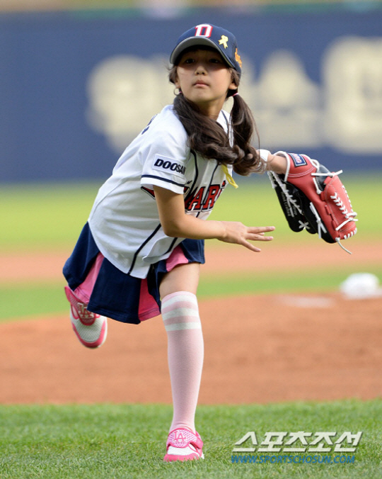 화리 양은 깜찍한 외모와 멋진 투구폼으로 공을 던지며 야구장을 찾은 팬들을 미소 짓게 했다. 아빠 홍성흔 역시 함박웃음을 지었다.