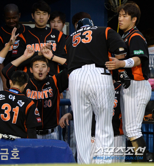 두산과 롯데의 주말 3연전 첫번째 경기가 30일 잠실구장에서 열렸다. 4회초 롯데 히메네스가 두산 니퍼트의 투구를 받아쳐 우측담장을 넘어가는 솔로홈런을 날렸다. 홈인하며 동료들과 기쁨을 나누는 히메네스. 잠실=허상욱 기자 wook@sportschosun.com/2014.05.30/ |
