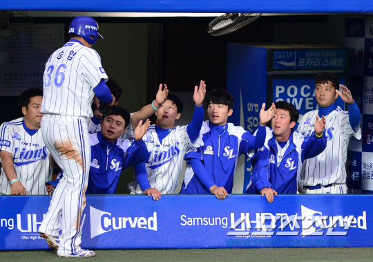 3일 대구 시민구장에서 프로야구 삼성과 KIA의 주중 3연전 첫 번째 경기가 열렸다. 삼성 이승엽이 2회 1사 3루에서 이지영의 희생플라이 타구 때 득점에 성공했다. 덕아웃에서 동료들과 하이파이브를 나누고 있는 이승엽. 대구=송정헌 기자 songs@sportschosun.com/2014.06.03