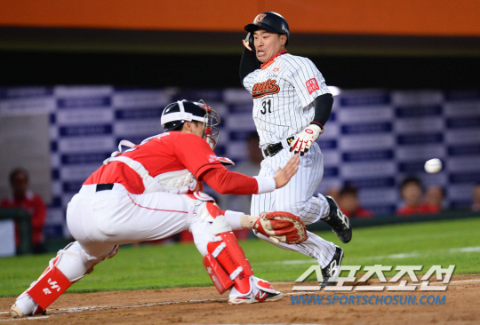 2014 프로야구 롯데자이언츠와 SK와이번즈의 경기가 25일 부산 사직야구장에서 열렸다. 롯데 1회말 2사 만루 황재균의 적시안타때 2루주자 손아섭이 홈으로 쇄도해 세이프 되고 있다. 부산=최문영 기자 deer@sportschosun.com