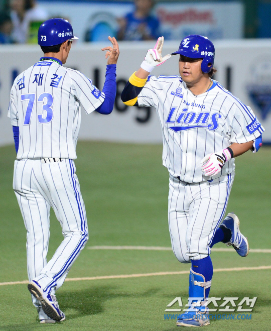 4일 대구 시민구장에서 프로야구 삼성과 KIA의 경기가 열렸다. 삼성 박석민이 3회 2사 1, 3루에서 KIA 한승혁을 상대로 좌중월 3점 홈런을 날렸다. 그라운드를 돌며 김재걸 코치와 하이파이브를 나누고 있는 박석민. 대구=송정헌 기자 songs@sportschosun.com/2014.06.04