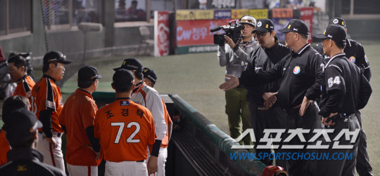 21일 서울 목동야구장에서 2014 프로야구 한화와 넥센의 경기가 열렸다. 6회말 2사 2루서 넥센 윤석민의 3루 선상의 안타 때 항의하던 김응용 감독이 퇴장 당하자 한화 코칭스텝과 심판진이 언쟁을 벌이고 있다. 김경민 기자 kyungmin@sportschosun.com / 2014.05.21.