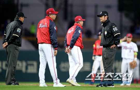 29일 광주 챔피언스필드에서 프로야구 KIA와 SK의 주중 3연전 첫 번째 경기가 열렸다. SK 2회 무사 1,3루에서 1루주자 조동화가 2루 도루를 시도했다. 조동화가 KIA 2루수 안치홍에게 태그를 먼저 당했으나 나광남 2루심은 세이프를 선언하는 오심이 발생했다. 선동열 감독이 그라운드에 나와 나광남 심판에게 항의하고 있다. 광주=송정헌 기자 songs@sportschosun.com/2014.04.29