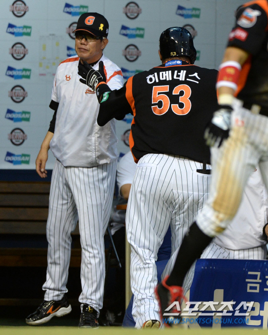 두산과 롯데의 주말 3연전 첫번째 경기가 30일 잠실구장에서 열렸다. 4회초 롯데 히메네스가 두산 니퍼트의 투구를 받아쳐 우측담장을 넘어가는 솔로홈런을 날렸다. 홈인하며 김시진 감독과 기쁨을 나누는 히메네스. 잠실=허상욱 기자 wook@sportschosun.com/2014.05.30/