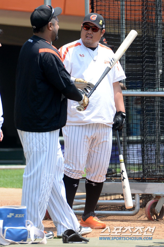 18일 부산 사직구장에서 롯데와 넥센의 주말 3연전 마지막날 경기가 예정된 가운데 양팀 선수들이 훈련을 펼쳤다. 롯데 최준석과 히메네스가 타격훈련을 하며 이야기를 나누고 있다. 부산=허상욱 기자 wook@sportschosun.com/2014.05.18/