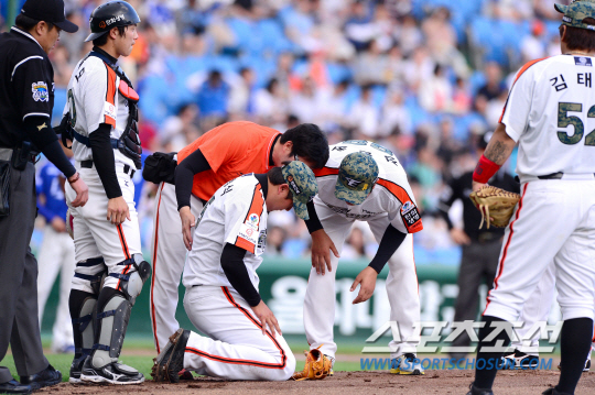 선발로 등판한 한화 유창식이 1회 2사에서 마운드를 내려왔다. 유창식은 삼성 최형우의 볼에 팔을 맞고 부상 교체 됐다. 타구를 맞고 고통스러워 하고 있는 유창식. 대전=송정헌 기자 songs@sportschosun.com