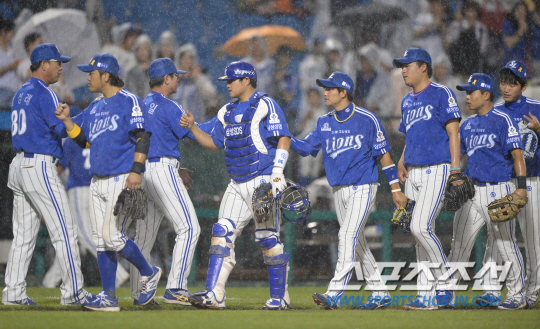 한화와 삼성이 7일 대전 한밭구장에서 주말 3연전 두 번째 경기를 펼쳤다. 삼성이 한화에 7대4로 승리하며 전날 패배를 설욕했다. 경기 종료 후 하이파이브를 나누고 있는 삼성 선수들. 대전=송정헌 기자 songs@sportschosun.com