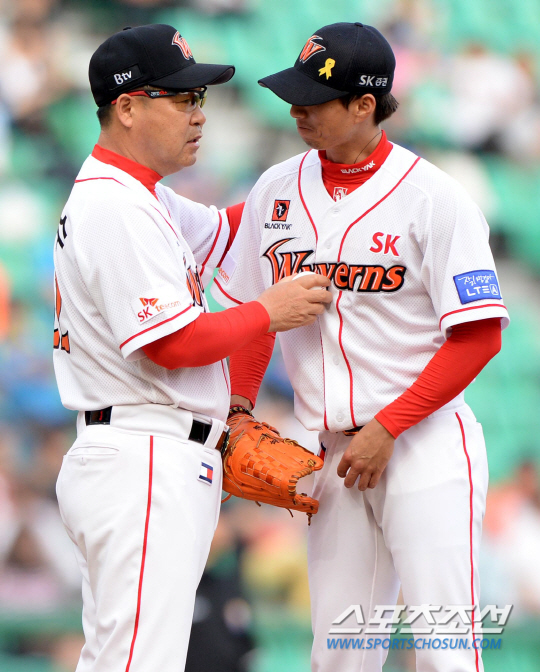 SK와 롯데의 주말 3연전 마지막 경기가 8일 인천 문학구장에서 열렸다. 6회초 2사 1루 SK 고효준이 마운드를 내려가며 이만수 감독과 이야기를 하고 있다. 인천=허상욱 기자 wook@sportschosun.com/2014.06.08/ |