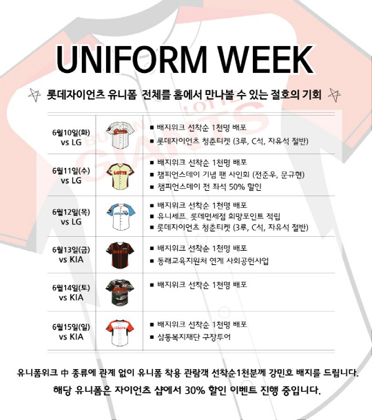 이번 행사는 롯데 유니폼 전체를 홈경기에 모두 접할 수 있도록 마련한 것으로 먼저 10일은 홈 유니폼, 11일은 챔피언 유니폼(챔피언스데이), 12일은 유니세프 유니폼(유니세프데이)을 착용한다. 또 13일은 원정 유니폼을, 14일은 밀리터리 유니폼, 15일은 선데이 유니폼을 착용한다.