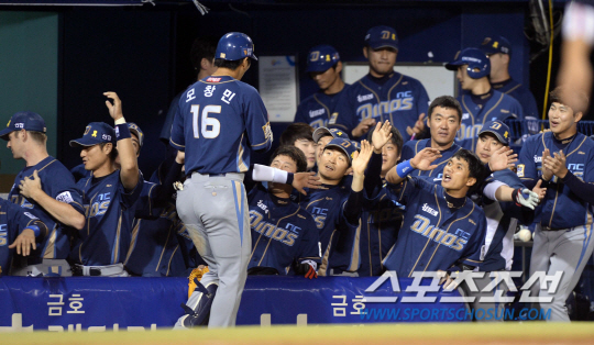 10일 오후 서울 잠실야구장에서 2014 프로야구 NC와 두산의 경기가 열렸다. 9회초 무사서 NC 모창민이 중월 솔로홈런을 친 후 덕아웃에서 동료들과 하이파이브를 나누고 있다. 잠실=김경민 기자 kyungmin@sportschosun.com / 2014.06.10.