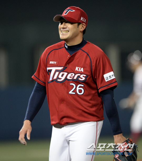 2014 프로야구 넥센과 KIA의 주중 3연전 첫번째날 경기가 8일 목동구장에서 열렸다. 8회말 수비를 마친 KIA 서재응이 미소를 지으며 덕아웃으로 향하고 있다. 목동=허상욱 기자 wook@sportschosun.com/2014.04.08/ |
