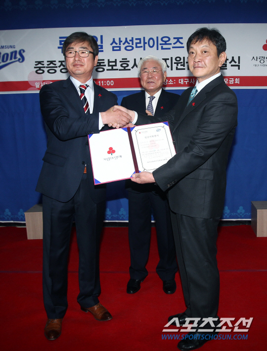 삼성 류중일 감독이 30일 오전 11시 대구 중구 삼덕동 대구사회복지공동모금회에서 열린 기부금 전달식에 참석해 대구 사회복지공동모금회 조해녕 회장(가운데), 인제요양원 조만섭 원장과 함께 기념촬영을 하고 있다.