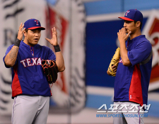 텍사스 레인저스 추신수가 6일(한국시각) 미국 플로리다주 세인트피터스버그 트로피카나필드에서 열리는 2014 메이저리그 탬파베이 레이스와의 원정경기에 1번타자 좌익수로 선발출전했다. 경기 전 추신수와 다르빗슈가 외야에서 훈련을 하며 이야기를 나누고 있다. 세인트피터스버그(미국 플로리다주)=정재근기자 cjg@sportschosun.com/2014.04.06/