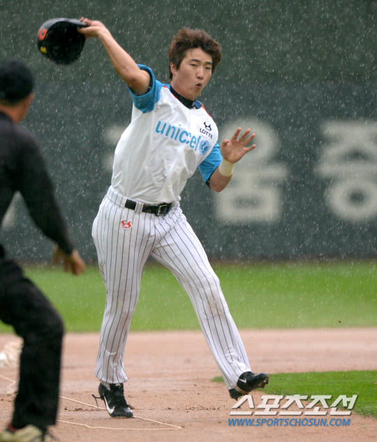 롯데와 LG 모두 선발 로테이션의 한 자리가 마땅치 않은 상황이다. 제 5선발이 부실하다. 따라서 롯데는 13일 홈 사직 KIA전에서 사이드암 홍성민을 선발 투입할 예정이었다. 홍성민은 최근 2군에서 계속 선발 등판 준비를 해왔다. 12일 부산 사직구장에서 예정됐던 롯데와 LG의 주중 3연전 마지막 경기가 우천으로 취소됐다. 롯데 정훈이 우천 취소 세리머니를 하고 있다. 부산=허상욱 기자 wook@sportschosun.com/2014.06.12/