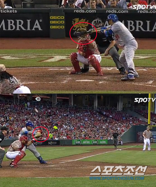 류현진은 1, 2구 번트시도에서 모두 파울을 기록했다. 이때 류현진은 2구 파울 직후 '타격방해'라며 항의했다. 번트 순간 포수 미트에 배트가 닿았기 때문이다. 이는 느린 그림에서 명백하게 확인된다.
