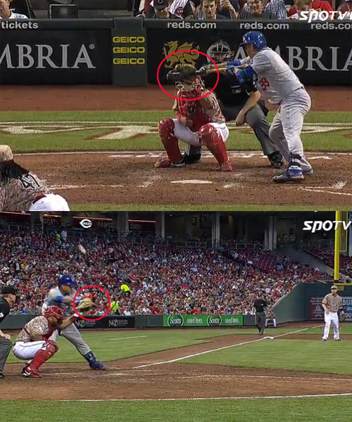 류현진 배트, 포수가 미트를 너무 내민 것 아닌가?", "