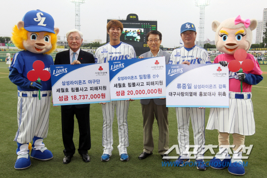 삼성 임창용이 13일 대구 두산전에서 앞서 세월호 피해지원 성금 2000만원을 대구사회복지 공동모금회에 전달했다.