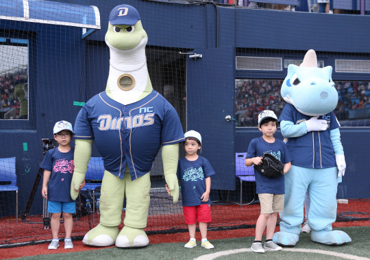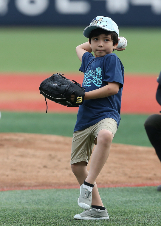 마산구장에 반가운 3형제가 왔다. 바로 카스포인트 라인업 광고에서 "인생은 이호준처럼~"을 외치던 문메이슨 형제가 15일 창원 NC-한화전에 앞서 시구를 했다.