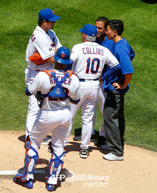 | 16일 뉴욕 시티필드에서 열린 뉴욕 메츠-샌디에이고 파드리스전. 선발 등판한 마쓰자카가 1회 표정이 안 좋자 콜린스 감독이 마운드에 올라가 상태를 체크하고 있다. ⓒAFPBBNews = News1 |