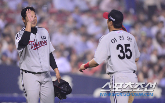 서울 라이벌 두산과 LG의 프로야구 경기가 17일 잠실야구장에서 펼쳐 졌다. LG 선발 류제국이 5회 두산 김재호의 타구를 어렵게 잡아 낸 이진영과 하이파이브를 하고 있다. 잠실=조병관기자 rainmaker@sportschosun.com/2014.06.17/ |