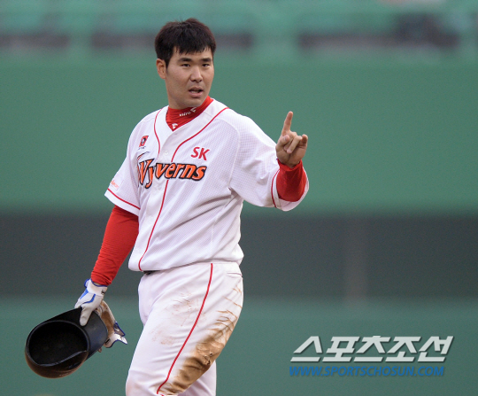 17일 오후 인천 문학야구장에서 2014 프로야구 삼성과 SK의 경기가 열렸다. 1회말 2사 2루서 SK 이재원이 1타점 적시타를 친 후 덕아웃을 향해 손짓하고 있다. 인천=김경민 기자 kyungmin@sportschosun.com / 2014.06.17.
