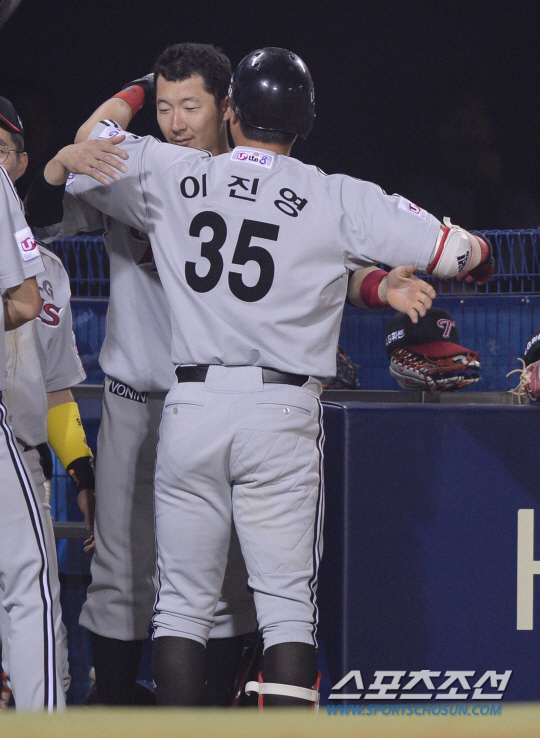 19일 오후 서울 잠실야구장에서 2014 프로야구 LG와 두산의 경기가 열렸다. 7회초 2사 1루서 LG 이진영이 우중월 2점 홈런을 친 후 덕아웃에서 손주인과 포옹을 나누고 있다. 잠실=김경민 기자 kyungmin@sportschosun.com / 2014.06.19.
