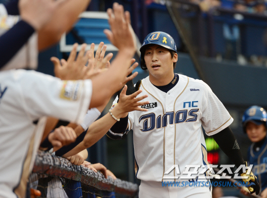 삼성 라이온즈와 NC 다이노스의 2014 프로야구 경기가 20일 마산구장에서 열렸다. 1회말 2사 NC 나성범이 우월 솔로포를 치고 들어와 축하를 받고 있다. 마산=정재근 기자 cjg@sportschosun.com