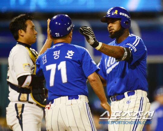 삼성 라이온즈와 NC 다이노스의 2014 프로야구 경기가 20일 마산구장에서 열렸다. 7회초 2사 3루 삼성 나바로가 중월 투런포를 치고 들어오며 김평호 코치의 축하를 받고 있다. 마산=정재근 기자 cjg@sportschosun.com