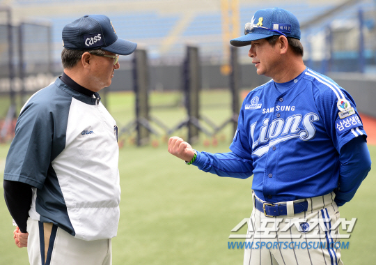 삼성 라이온즈와 NC 다이노스의 2014 프로야구 경기가 20일 마산구장에서 열리는 가운데 경기 전 삼성 류중일 감독과 NC 김경문 감독이 인사를 나누고 있다. 광주=정재근 기자 cjg@sportschosun.com/2014.06.20/ |