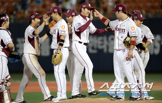 넥센과 SK의 주말 3연전 마지막 경기가 22일 목동구장에서 열렸다. 10-5 승리를 거두며 주말 3연전을 모두 가져간 넥센 선수들이 기쁨을 나누고 있다. 목동=허상욱 기자 wook@sportschosun.com