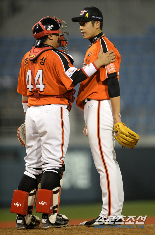 NC와 한화의 주말 3연전 첫번째 경기가 13일 창원 마산구장에서 열렸다. 6회말 1사 1루 위기를 맞은 한화 이태양이 포수 조인성과 이야기를 나누고 있다. 창원=허상욱 기자 wook@sportschosun.com/2014.06.13/