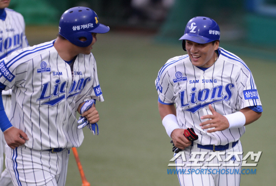 25일 오후 대구 시민야구장에서 2014 프로야구 넥센과 삼성의 경기가 열렸다. 1회말 2사 2,3루서 삼성 김태완의 적시타 때 홈에 들어온 이승엽과 채태인이 기뻐하고 있다. 대구=김경민 기자 kyungmin@sportschosun.com / 2014.06.25.